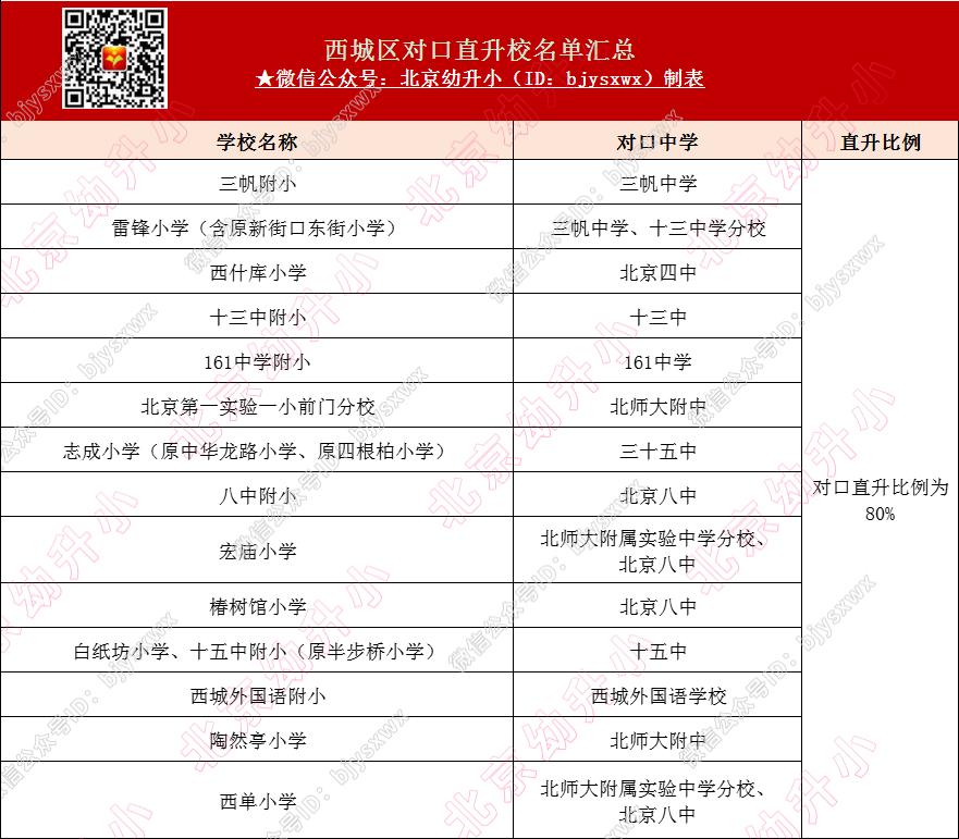 西城区入学家长注意,西城区对口直升比例从2015年的30%逐年提高到2020年的80%,具体小学对口直升中学名单,可参考下图: