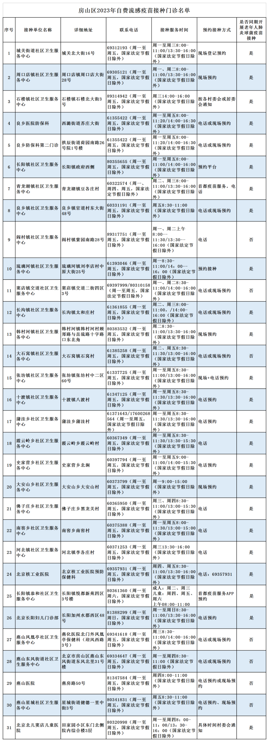 2023年流感疫苗预防接种工作即将开始房山区免费流感疫苗和自费流感疫苗接种门诊服务时间、咨询电话及详细地址已经为大家准备好了快收藏起来并转给需要的人。