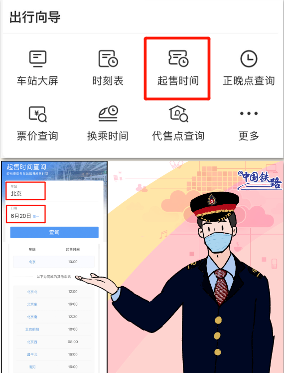 打开“铁路12306”APP——点击“我的”——在出行向导里点击“起售时间”——输入要查询的车站名和日期——就可以看到该车站的车票起售时间: