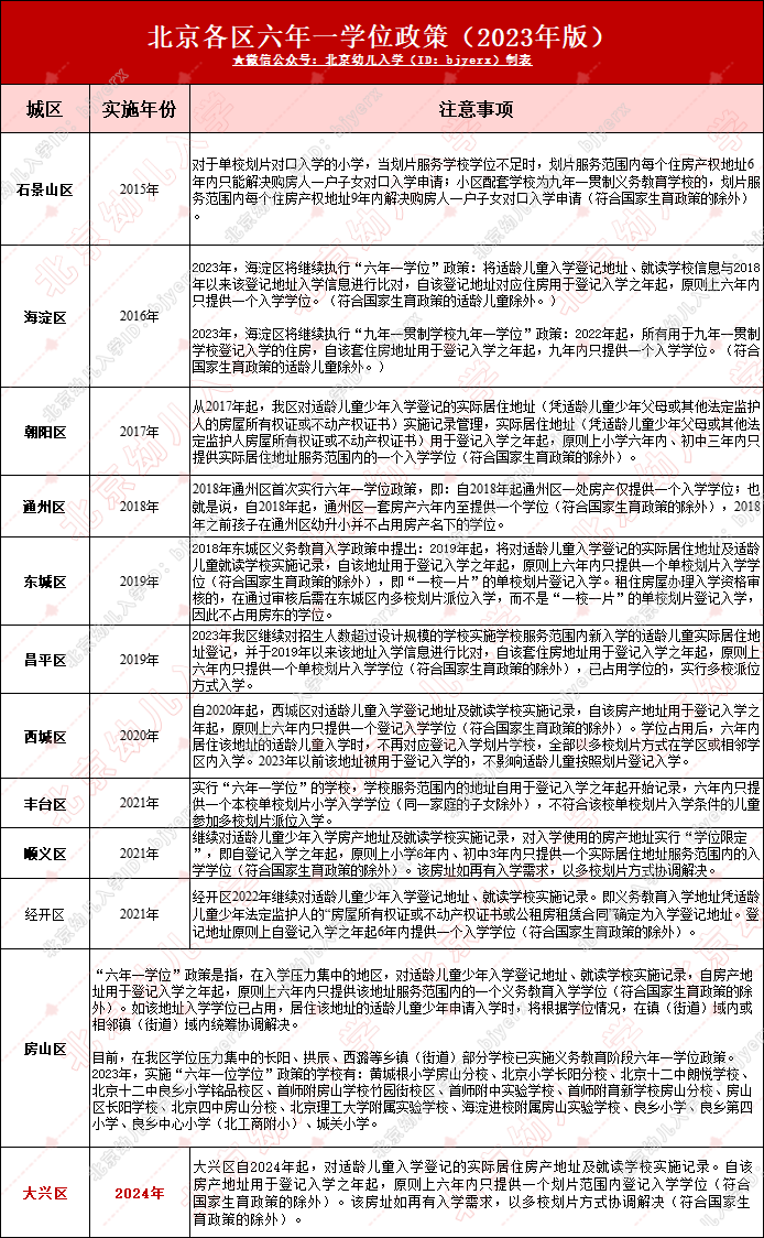 六年一学位政策并非16区都有,大兴区已明确在2024年起开始实施,2024年或将有12区延续实施六年一学位政策,其他城区家长也要重点关注 -