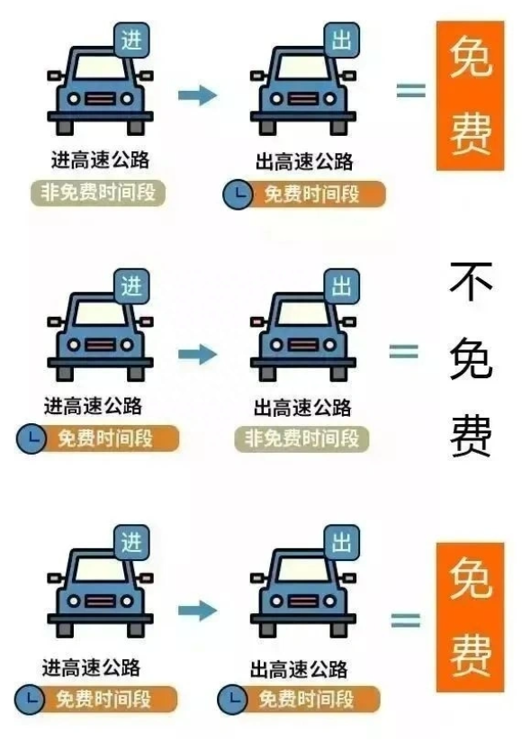 ①在非免费时段进入高速公路,但出高速时处于免费时段,则免费通行。温馨提示:提前驶入高速公路,不在收费站前等待免费时间到来,可避开拥堵高峰。只要从收费站驶离高速公路的时间点在免费时间内,均能免费通行。