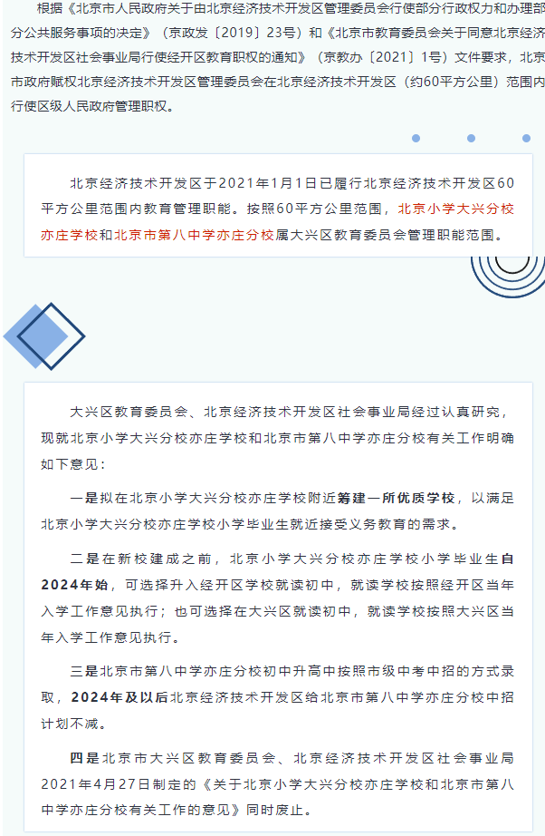 四是北京市大兴区教育委员会、北京经济技术开发区社会事业局2021年4月27日制定的《关于北京小学大兴分校亦庄学校和北京市第八中学亦庄分校有关工作的意见》同时废止。