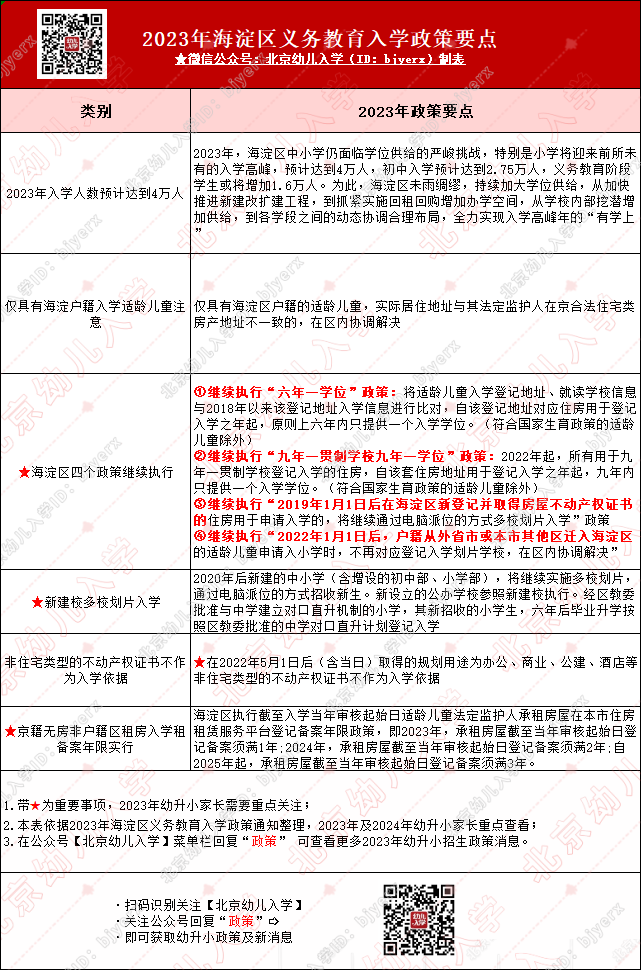 依据2023年入学情况,海淀区幼升小政策要点有六年一学位政策、新购房多校划片政策等入学要求,各位家长务必提前搞清楚,具体参考如下(实际以入学当年要求为准)。