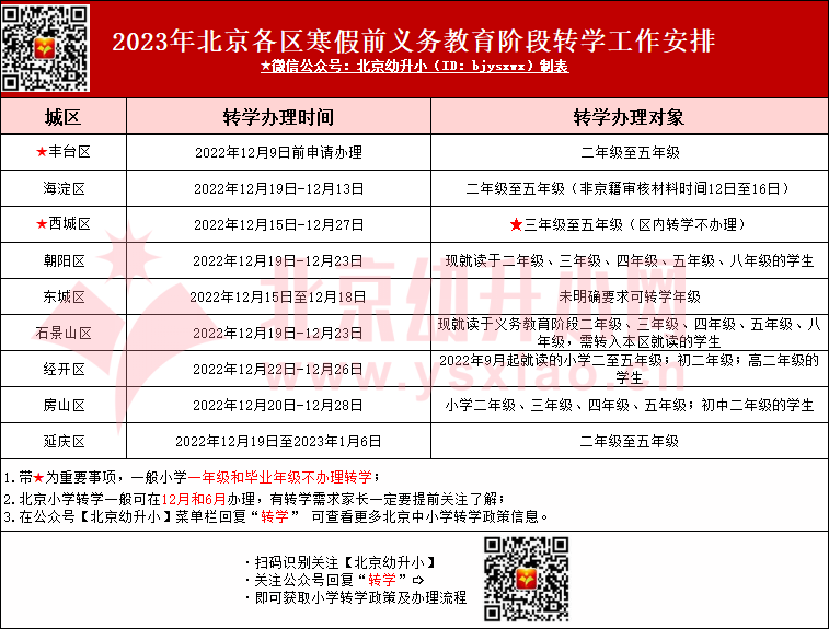 2024年寒假前转学通知暂未发布,各区转学时间、转学申请方式、转学要求不一致!参考寒假前各区非京籍转学要求如下: