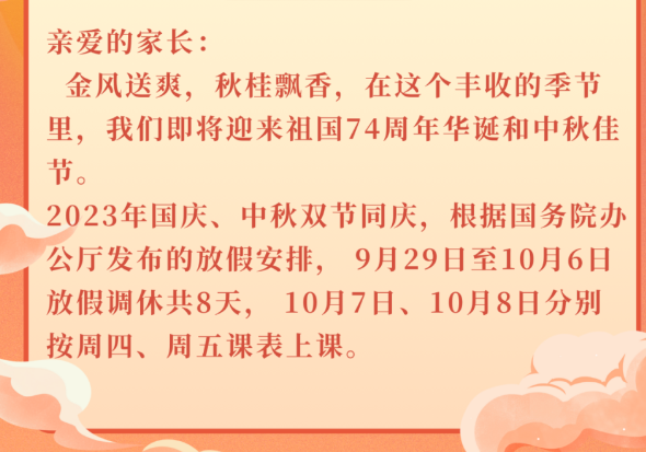 下一篇:2023年国庆中秋假期大兴区北京景山学校大兴实验学校致家长的一封信