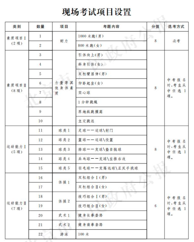 包括素质项目和运动能力项目。共设置4类22项考试内容,每名考生考4项,其中每类考1项。