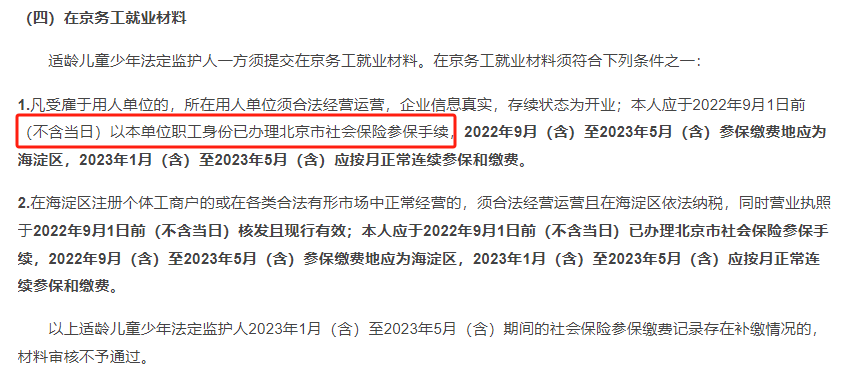2024年海淀区入学政策暂未发布,参考2023年海淀区非本市户籍适龄儿童少年入学审核实施细则,海淀区非京籍受雇于用人单位的家长需要以本单位职工身份缴纳社保: