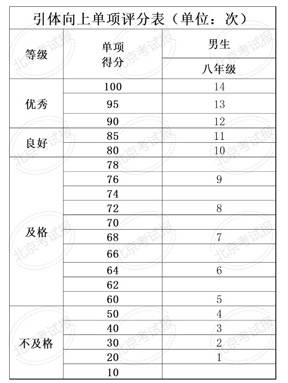 2023年北京八年级体测引起向上项目考核标准是什么?男生做多少个可以及格?良好、优秀的标准是什么?北京幼升小网为您分享男生八年级引起向上单项评分表,供您参考体测考核标准详细内容。