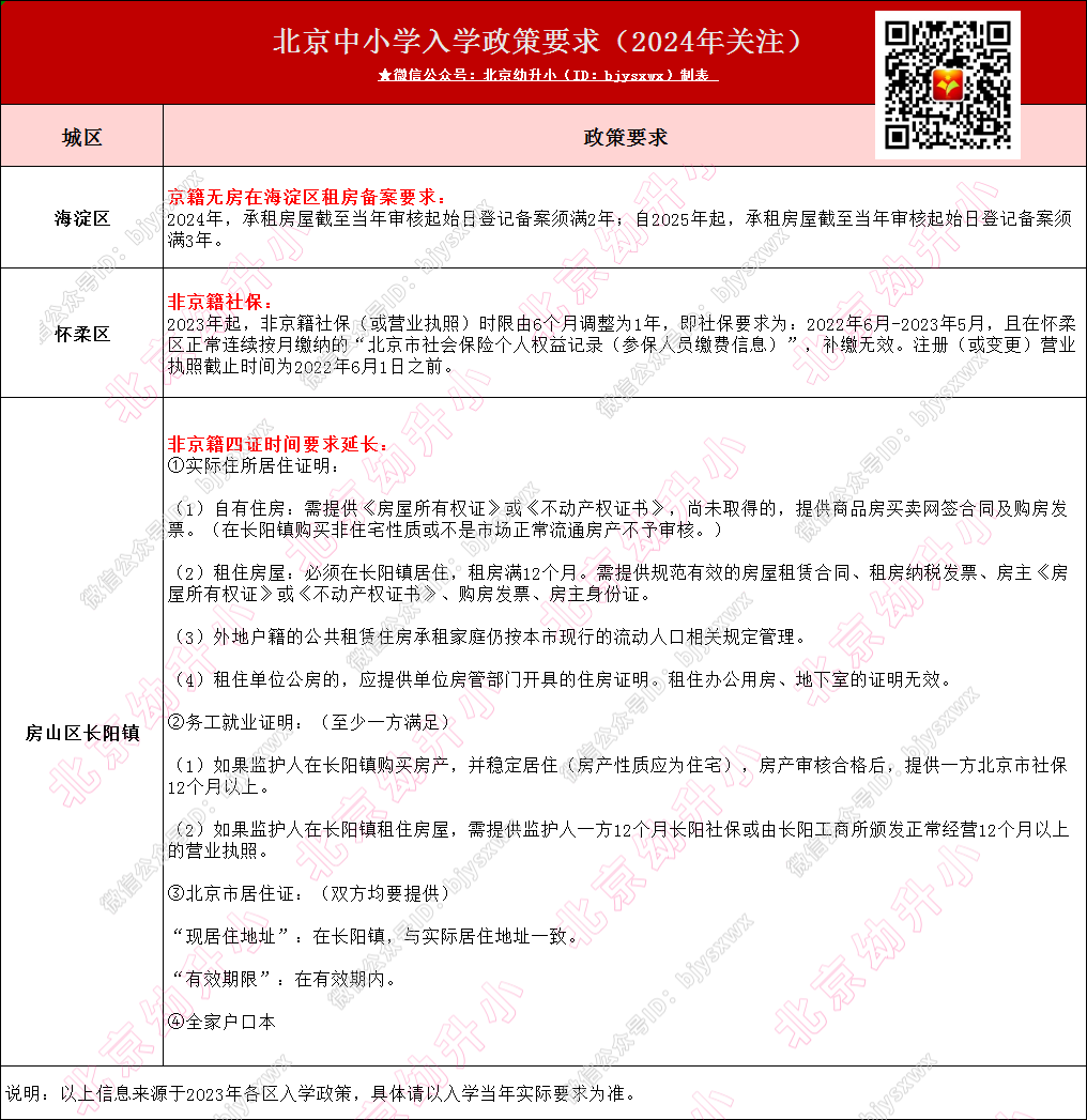 从各区来看,2024年材料变动的城区主要包括京籍无房在海淀区租房上学家庭,怀柔区和房山区长阳镇的非京籍人群,具体如下:
