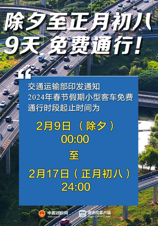 2024年春节假期小型客车连续9天免费通行,除夕零点起实行