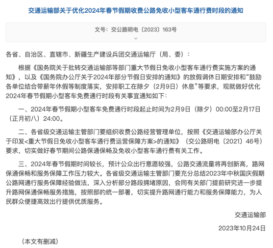 交通运输部发布关于优化2024年春节假期收费公路免收小型客车通行费时段的通知。