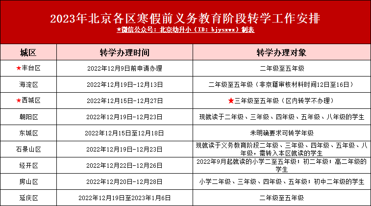 北京中小学寒假前各区转学时间安排及转学办理对象
