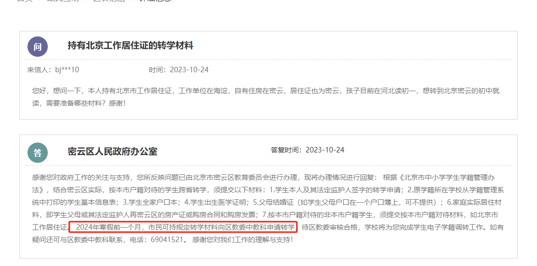 根据密云区人民政策回答家长提问:密云区转学请在2024年寒假前一个月向区教委申请转学: