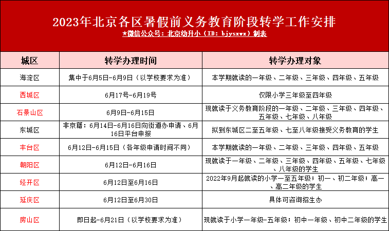 北京中小学暑假前各区转学时间安排及转学办理对象