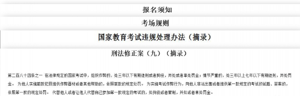 4.阅读“报名须知”、“考场规则”、“国家教育考试违规处理办法(摘录)”和“刑法修正案(九)(摘录)”。