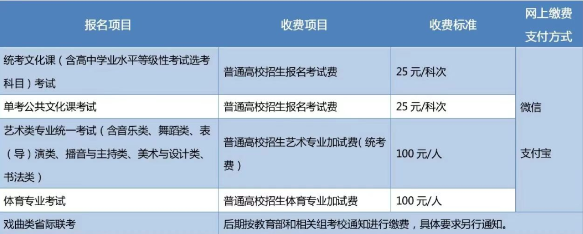 本阶段为通过报名资格初审的考生选报考试科目(项目)、填写个人简历等具体信息并缴费。缴费标准及网上缴费支付方式如下表。