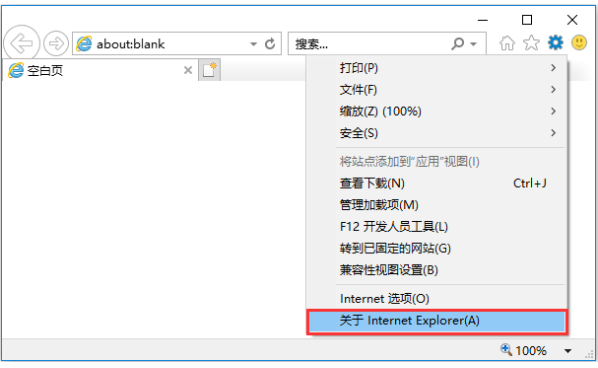 1.打开IE浏览器,点击“设置”-“关于Internet Explorer(A)”按钮,如下图: