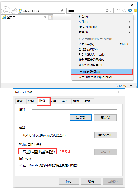 方法二:打开IE浏览器,点击“设置”-“Internet(选项)”-“隐私”,如下图: