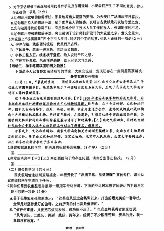 2023-2024学年第一学期海淀人大附中初二期中语文试卷