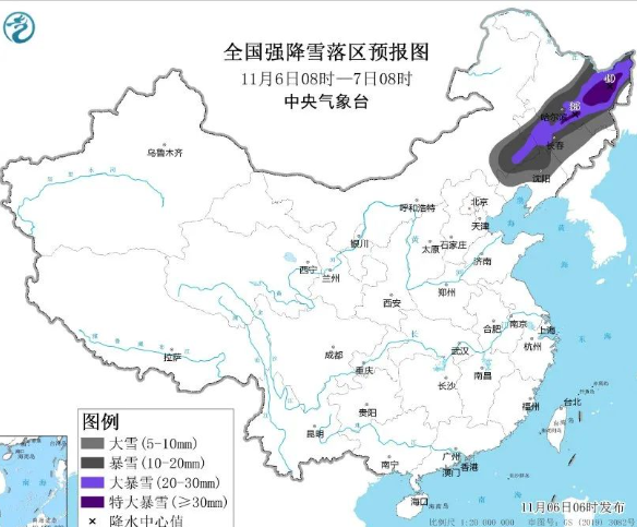 寒潮持续发威!11月6日东北地区强降雪进入最强时段,内蒙古东南部、黑龙江东北部和南部,吉林中西部等地部分地区有大暴雪局地特大暴雪,或突破历史同期极值,中央气象台6日继续发布暴雪橙色预警。