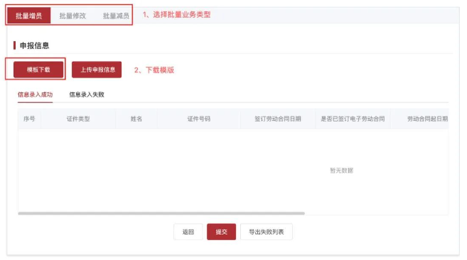 点击“批量导入”,进入劳动合同批量申报页面,即可进行批量增员。