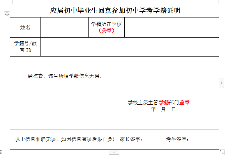 丰台区应届初中毕业生回京参加初中学考学籍证明模板