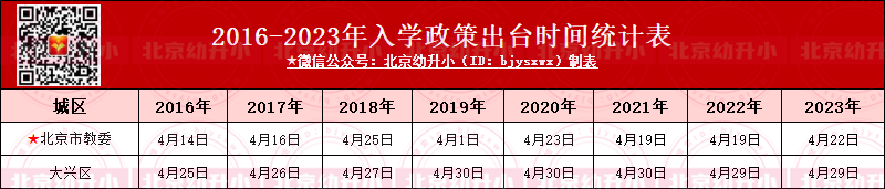 参考近几年,北京市义务教育政策、大兴区入学政策集中于四月中下旬发布,详细时间可参考下图: