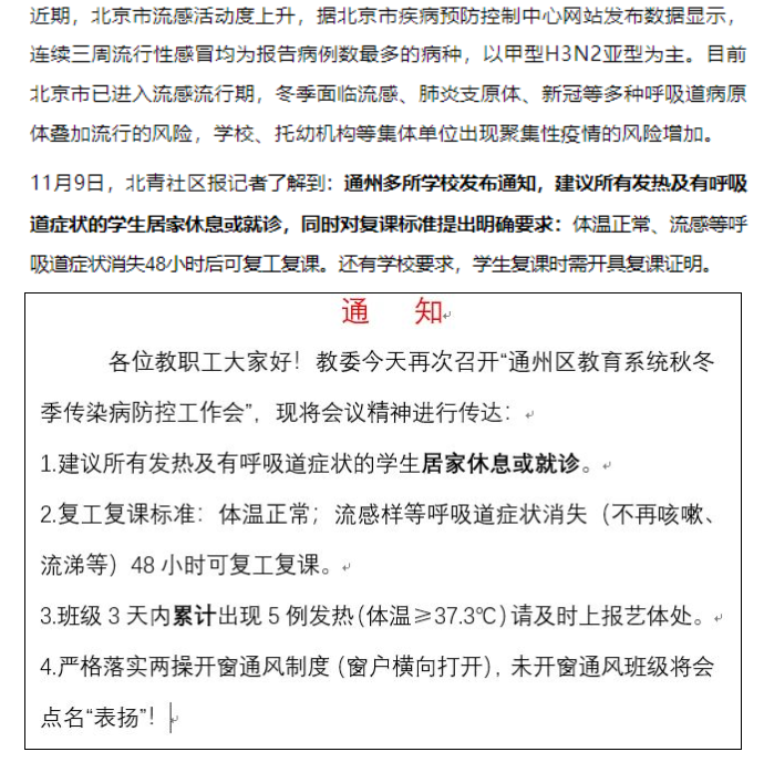 注意!通州多所学校发布通知,建议所有发热及有呼吸道症状的学生居家休息或就诊,同时对复课标准提出明确要求:体温正常、流感等呼吸道症状消失48小时后可复工复课。还有学校要求,学生复课时需开具复课证明。