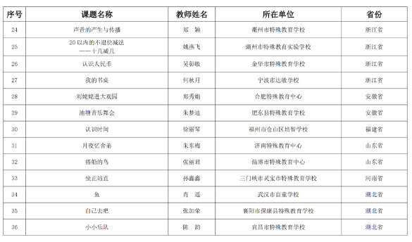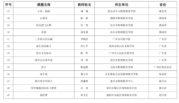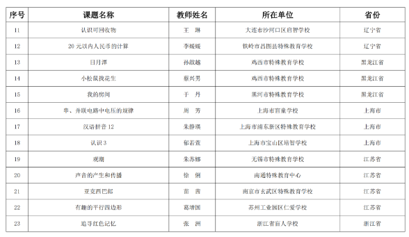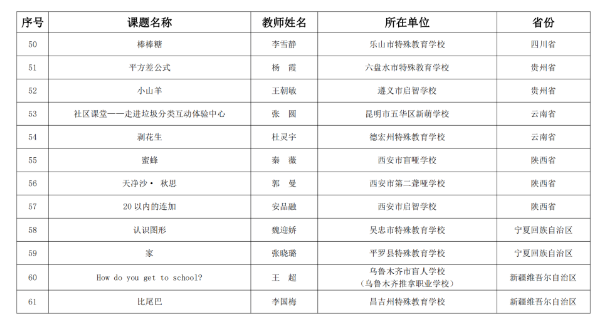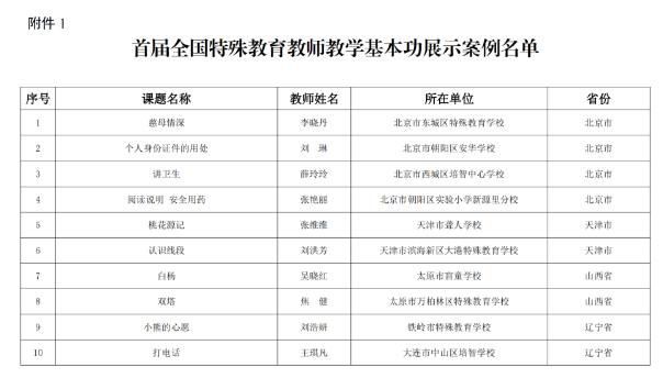 近日,教育部公布首届全国特殊教育教师教学基本功展示和融合教育优秀教育教学案例遴选结果。经省级教育行政部门推荐、专家网络评审和会议评审,确定了61项全国特殊教育教师教学基本功展示案例和102项全国融合教育优秀教育教学案例。