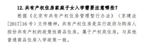 2017年9月《北京市共有产权住房管理暂行办法》发布当年已经明确,共有产权住房是指政府提供政策支持,由建设单位开发建设,销售价格低于同地段、同品质商品住房价格水平,并限定使用和处分权利,实行政府与购房人按份共有产权的政策性商品住房。共有产权住房属于产权类住房,与其他普通商品住房入学细则一致。