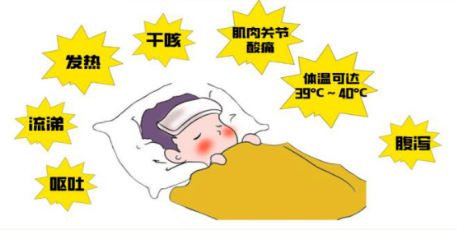 症状特征:突然高热(39℃以上)、头痛、全身酸痛、咳嗽、乏力,部分儿童伴呕吐、腹泻。