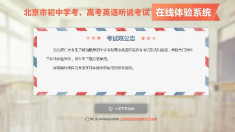 北京市2026年高考英语第一次听说考试以及初中学考英语第一次听说考试分别于2025年12月13日、14日进行。北京市初中学考、高考英语听说考试在线体验系统现已开通,服务时间为每天8时至22时。