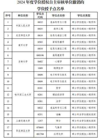 完整名单→立即下载:2024年度学位授权自主审核单位撤销的学位授予点名单