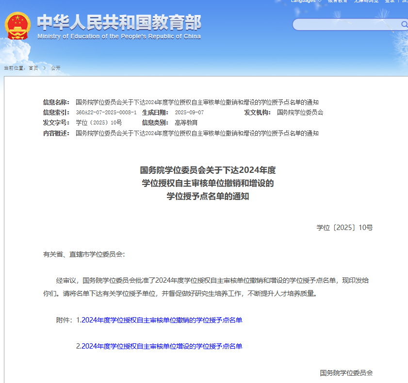 近日,教育部官网发布《国务院学位委员会关于下达2025年超常布局学位授予点名单的通知》《国务院学位委员会关于下达2024年学位授权自主审核单位撤销和增列的学位授予点名单的通知》《国务院学位委员会关于下达2024年度动态调整撤销和增设的学位授予点名单的通知》。