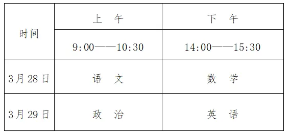 文化考试科目为语文、数学、政治、英语四科,每科满分为150分,四科满分为600分,使用国家通用语言文字作答。