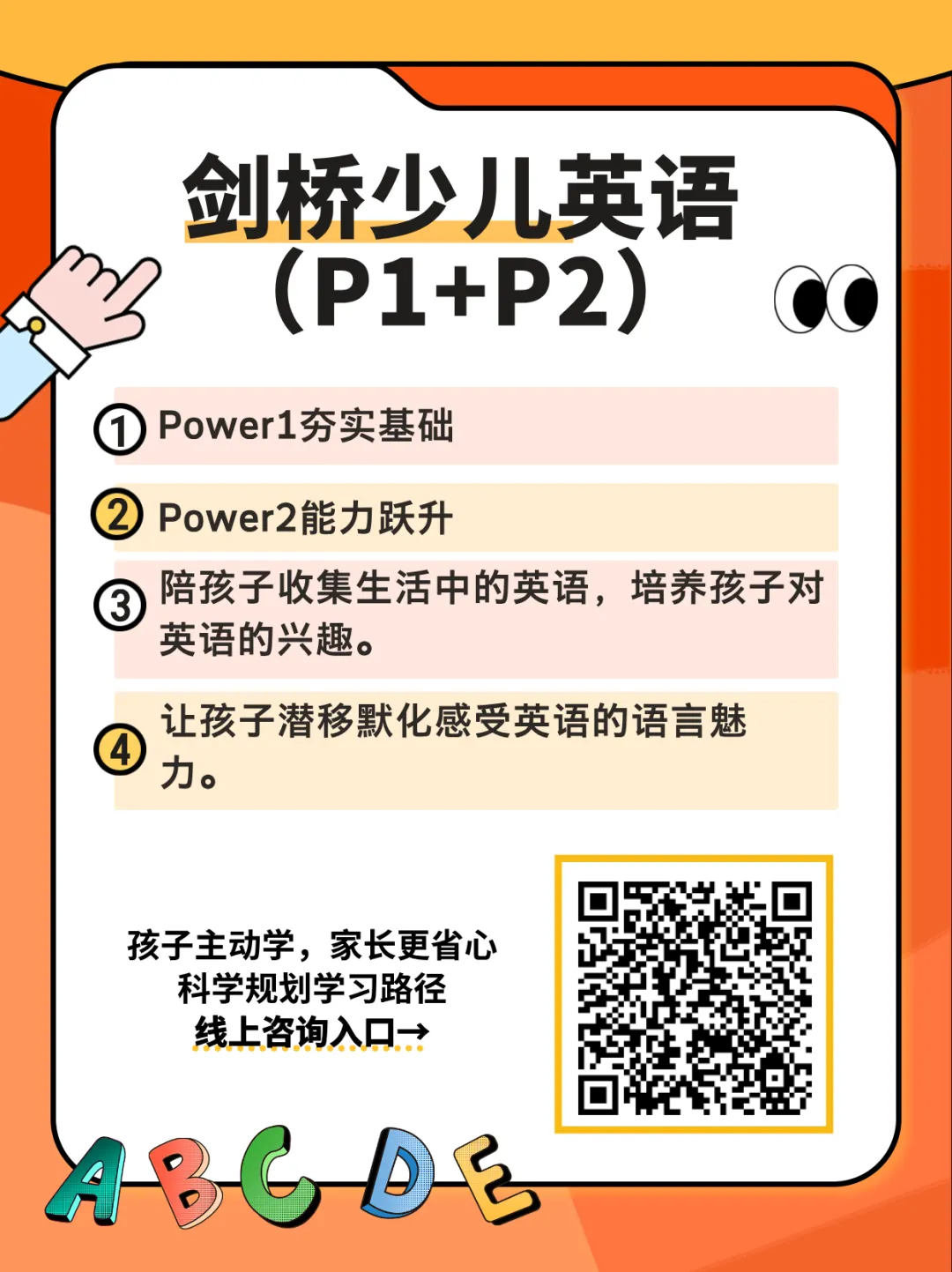 2026剑桥少儿英语Power1+2咨询入口开放,对应校内2-3年级水平。聚焦日常对话、自然拼读与基础读写,衔接剑桥考级体系,助力英语启蒙与能力进阶,速戳咨询锁定学习名额。