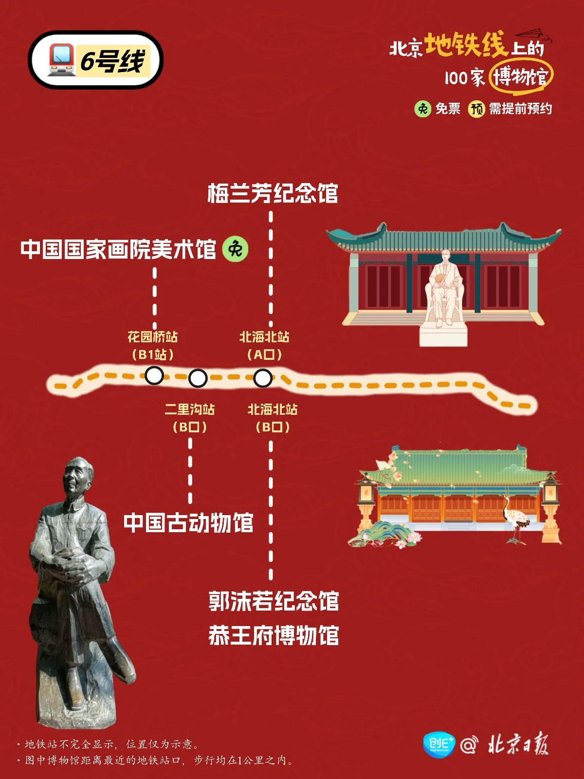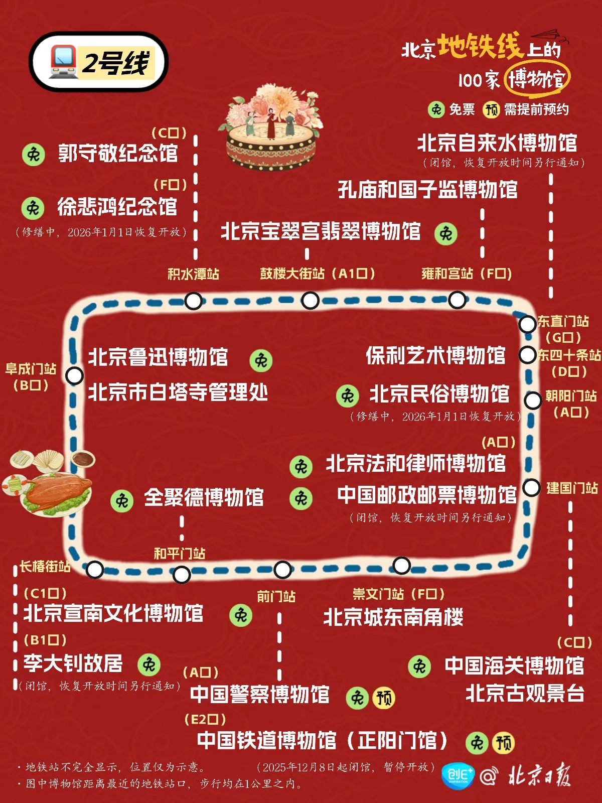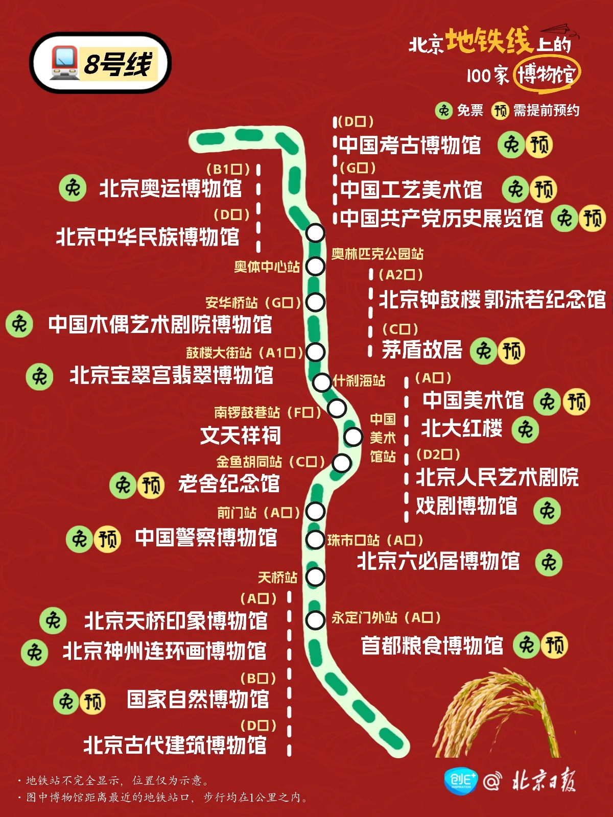 我们以出地铁口后步行1公里内为筛选标准,梳理出了整整100家!其中,最“富有”的北京地铁8号线,步行一公里内可抵达的博物馆多达22家,仅是天桥站,周围就有4家博物馆!