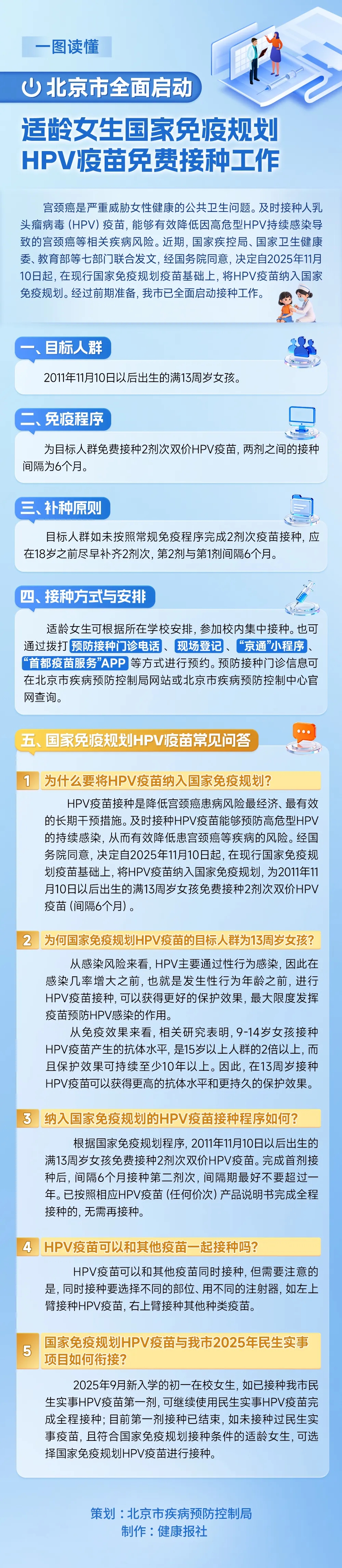 好消息!北京市全面启动适龄女生国家免疫规划HPV疫苗免费接种工作。为方便大家了解,特以图示呈现关键要点,包括接种适用年龄、接种时间安排、接种地点分布等,助力适龄女生及家长清晰掌握接种信息,及时参与接种。