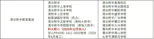 清华附中教育集团近几年扩军消息不断,早在1月初,北京科技大学附属小学正式加入清华附中教育集团,除外去年年底也有消息:清华附中承办宝山村九年一贯制学校。项目预计2026年10月开工,2028年6月竣工,清华大学附属中学参与建设设计。