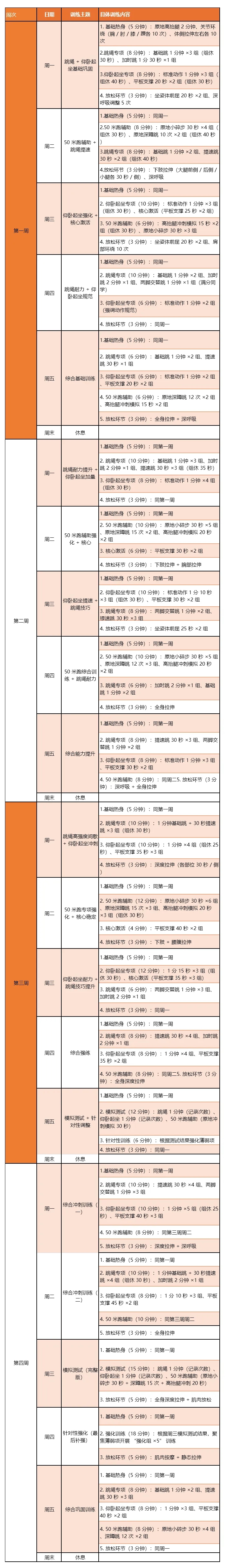 初中、高中1-3年级四周素质提升每日锻炼计划
