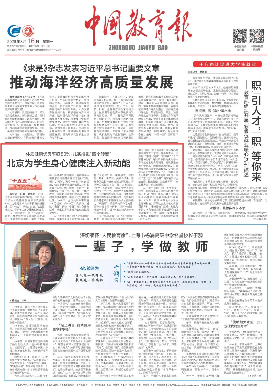 3月16日,《中国教育报》头版刊登了《体质健康优良率超80%,扎实推进“四个转变” ——北京为学生身心健康注入新动能》。全文如下: