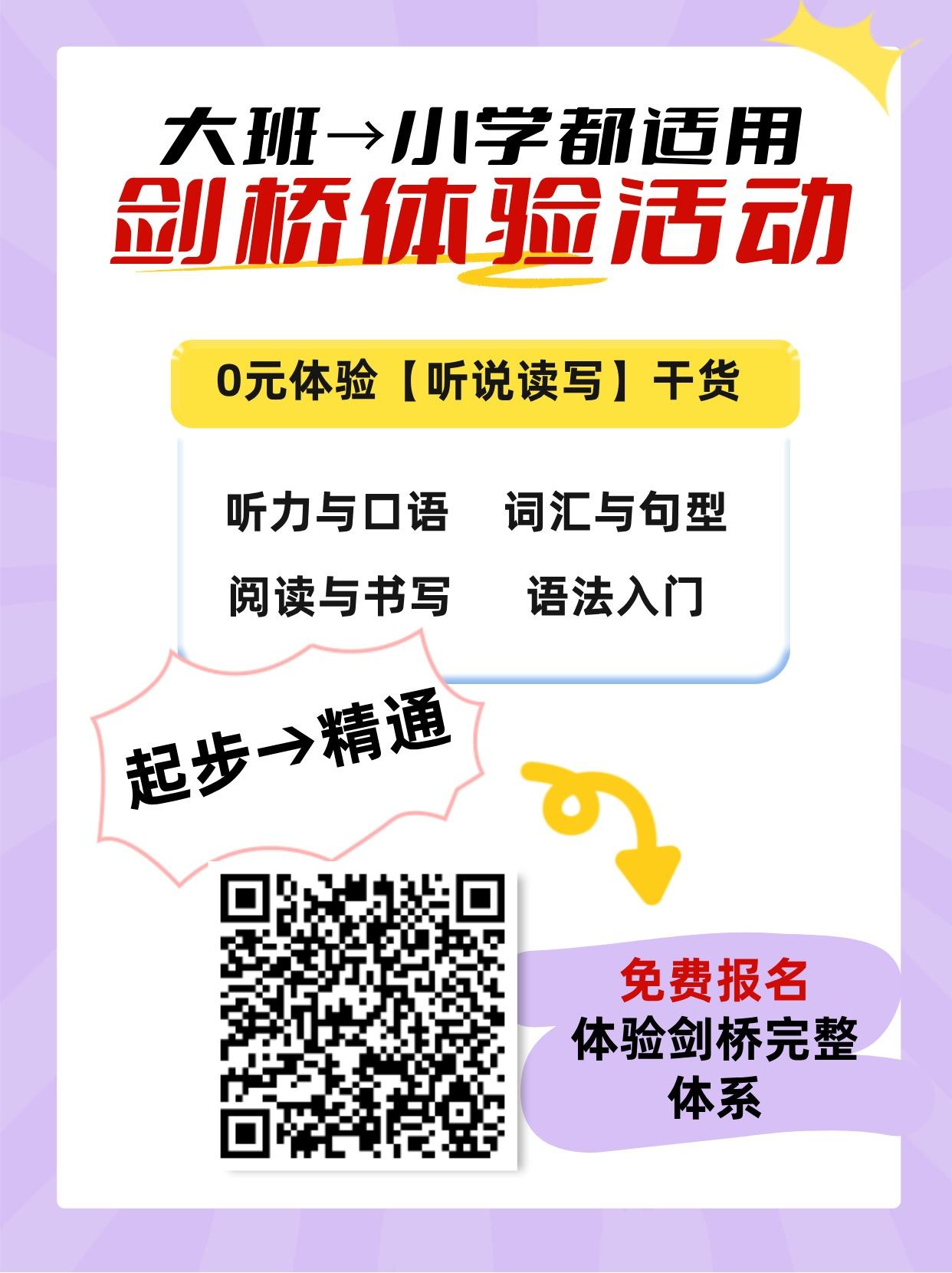 少儿剑桥英语体验活动来啦!适配大班到小学阶段,覆盖听力口语、词汇句型等全模块,帮孩子从入门稳步进阶到精通。带娃解锁完整剑桥体系,轻松夯实英语基础!