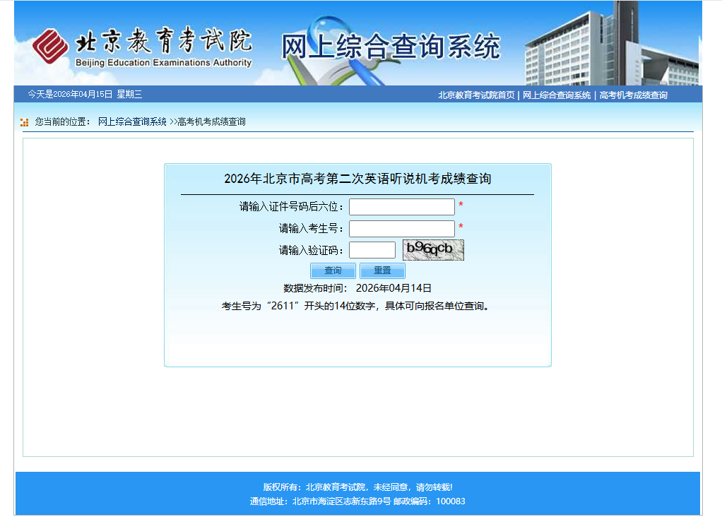 北京市2026年高考第二次英语听说机考成绩今起可查,考生可登录北京教育考试院网站查询,点击查询:https://query.bjeea.cn/queryService/rest/score/1520109