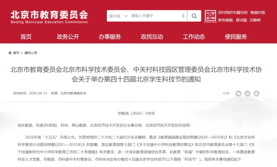 近日,北京市教委、市科委中关村管委会、市科协联合发布通知,正式启动第四十四届北京学生科技节。