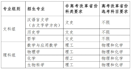 历史学专业,要求考生选考历史科目;哲学专业、中国少数民族语言文学(古文字学方向)专业,不限制考生选考科目(“3+1+2”模式省份,招生计划投放在历史类)。