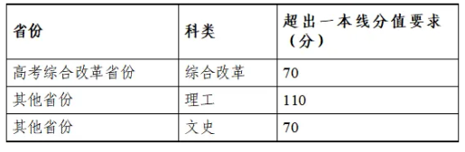 所有入围考生的高考成绩(不含政策性加分)须达到所在生源省份第一批本科录取控制分数线。对于合并本科批次的省份,参照该省份确定的相应最低录取控制分数线执行。