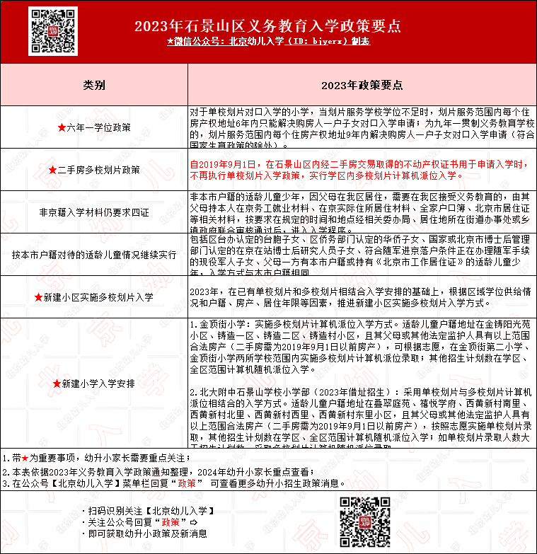 2024年幼升小入学政策暂未发布,参考2023年石景山区义务教育阶段入学工作意见的通知,2023年石景山区新增多校划片范围,2024年幼升小家长可先行参考准备: