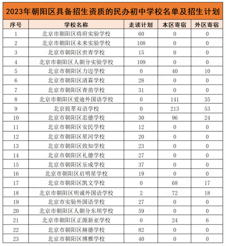 2023朝阳小升初民办学校入学招生学校有23所。民办学校与公办学校同步报名、同步录取、同步注册学籍。各学校按照区教委下达的招生计划在本市规定范围内接收学生,以招收本区学生为主。对于报名人数超过招生计划的,实行电脑随机派位录取。