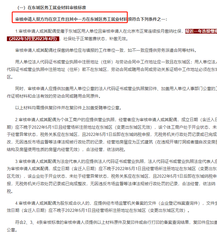 2024年幼升小入学政策将于四、五月发布,现阶段参考2023年要求:东城区需要父母双方在京社保,且至少一方东城区缴纳,时间要求为2022年5月(含)至2023年4月(2024年家长可推延一年进行准备)