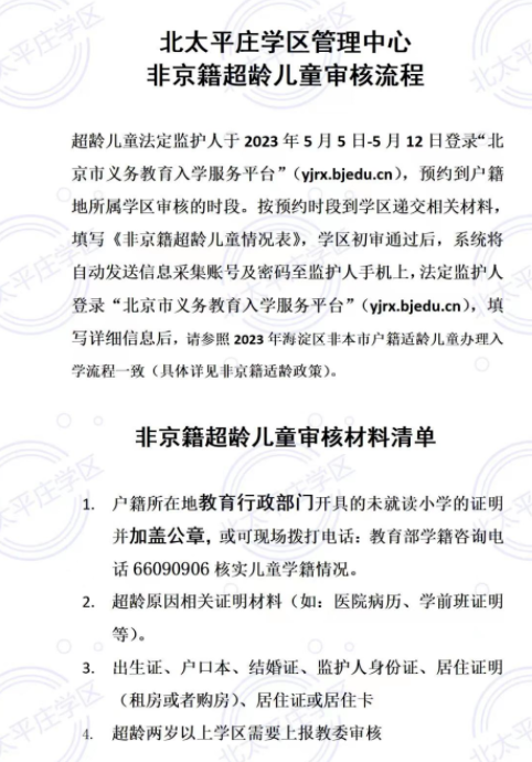海淀区2023年政策中未对超龄儿童入学方式有具体说明,但参考海淀区部分街道办、学区有发布超龄儿童入学要求,如北太平庄学区要求如下: